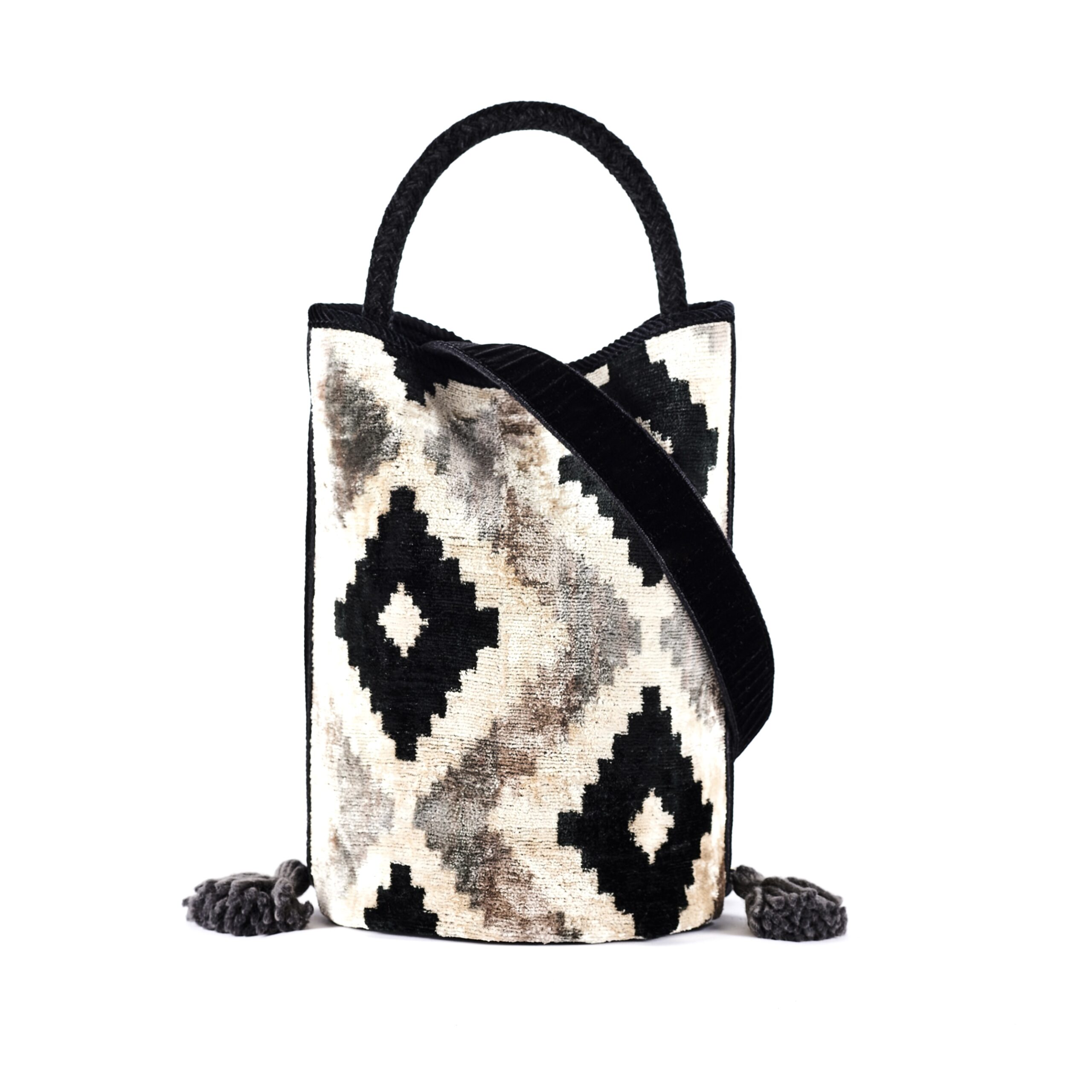 Secchiello in velluto jacquard realizzato a mano con nappe e rifiniture in velluto a contrasto, calamita e tasca interna, manico in ciniglia e tracolla in velluto con dettagli in camoscio.