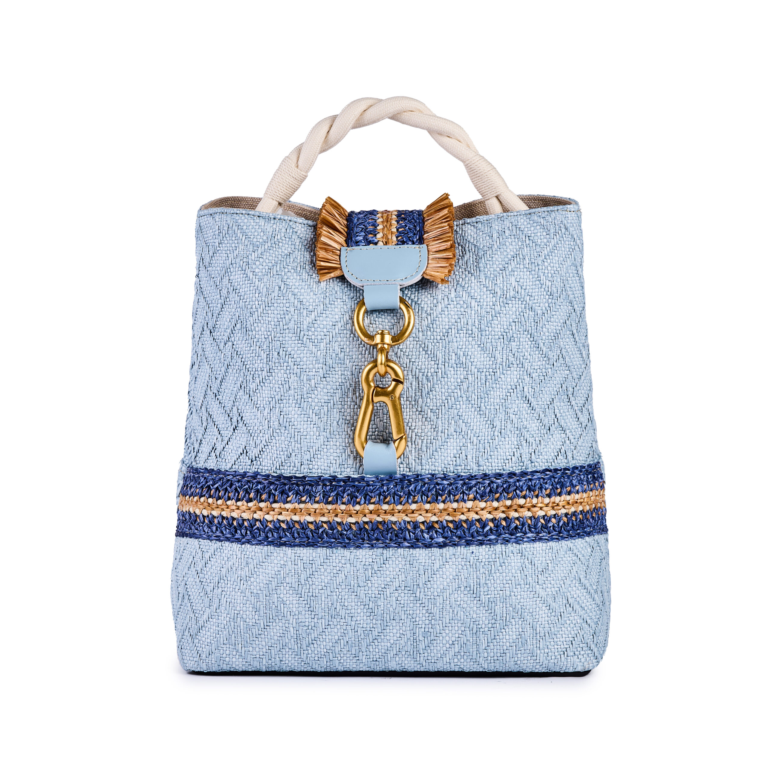 Jacquard raffia bucket bag with raffia details and fringes, woven cotton handle, snap hook closure, internal pocket and patterned shoulder strap with leather details.