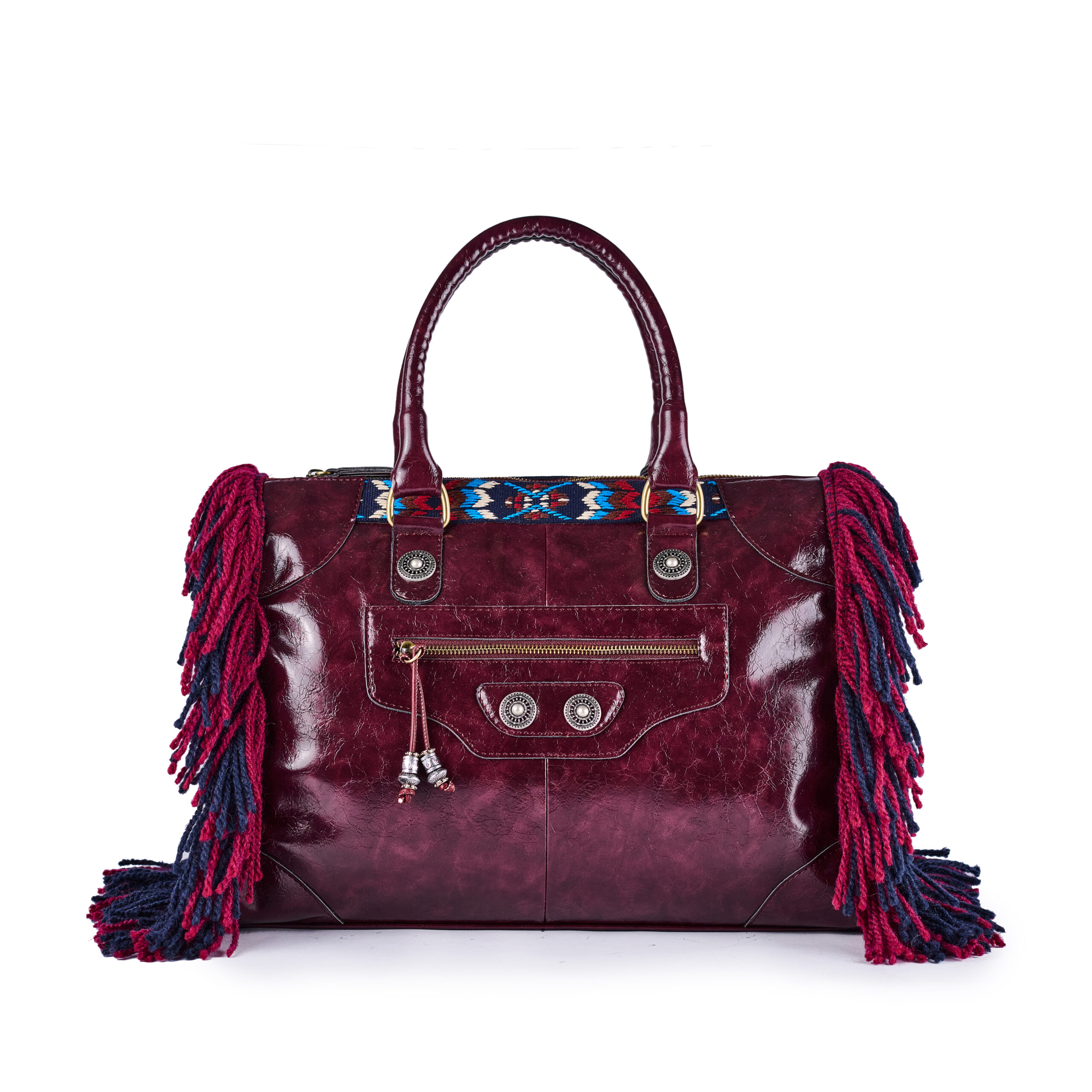 Borsa in ecopelle invecchiata con frange in lana, dettagli etnici, chiusura con zip e tracolla jacquard rimovibile.