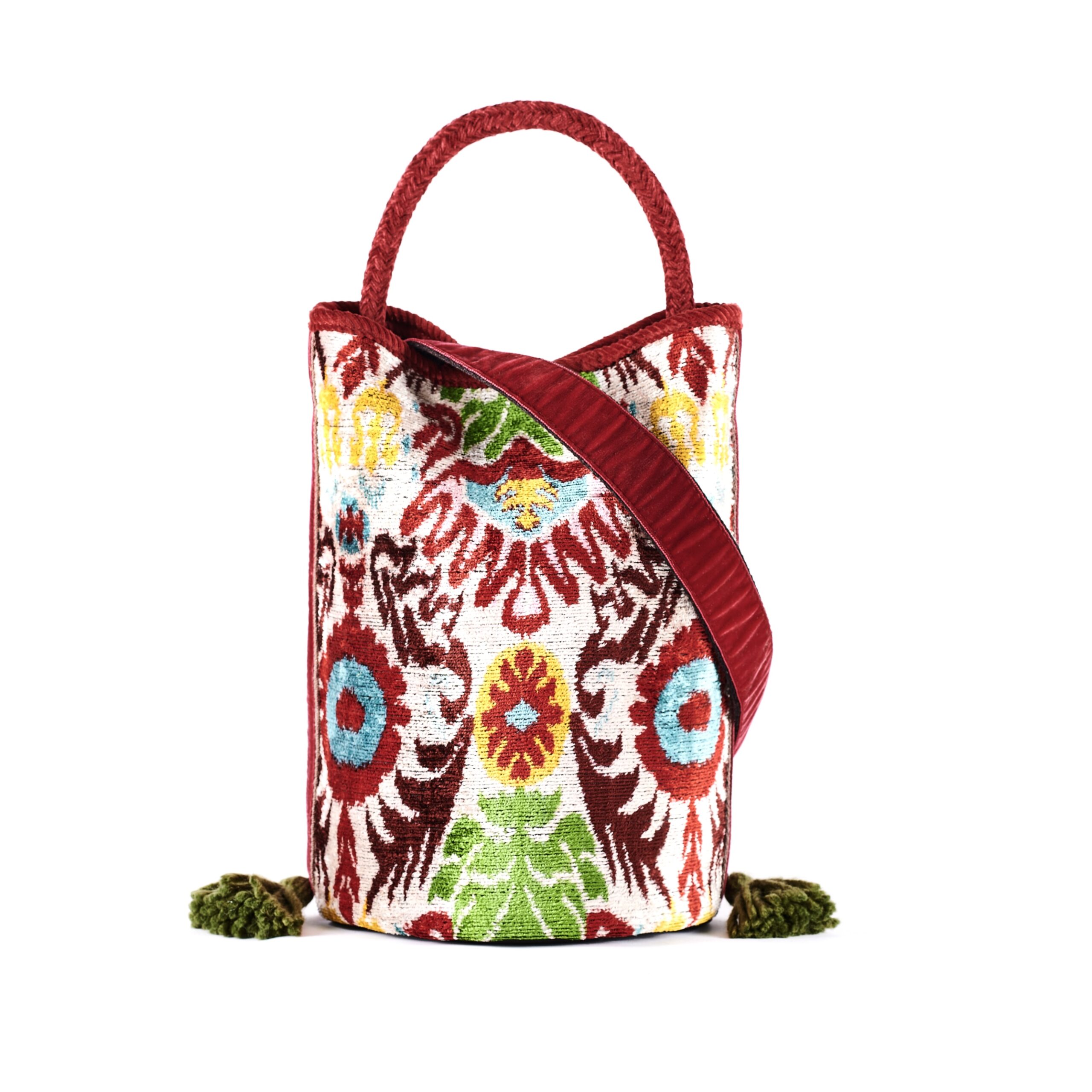 Secchiello in velluto jacquard realizzato a mano con nappe e rifiniture in velluto a contrasto, calamita e tasca interna, manico in ciniglia e tracolla in velluto con dettagli in camoscio.