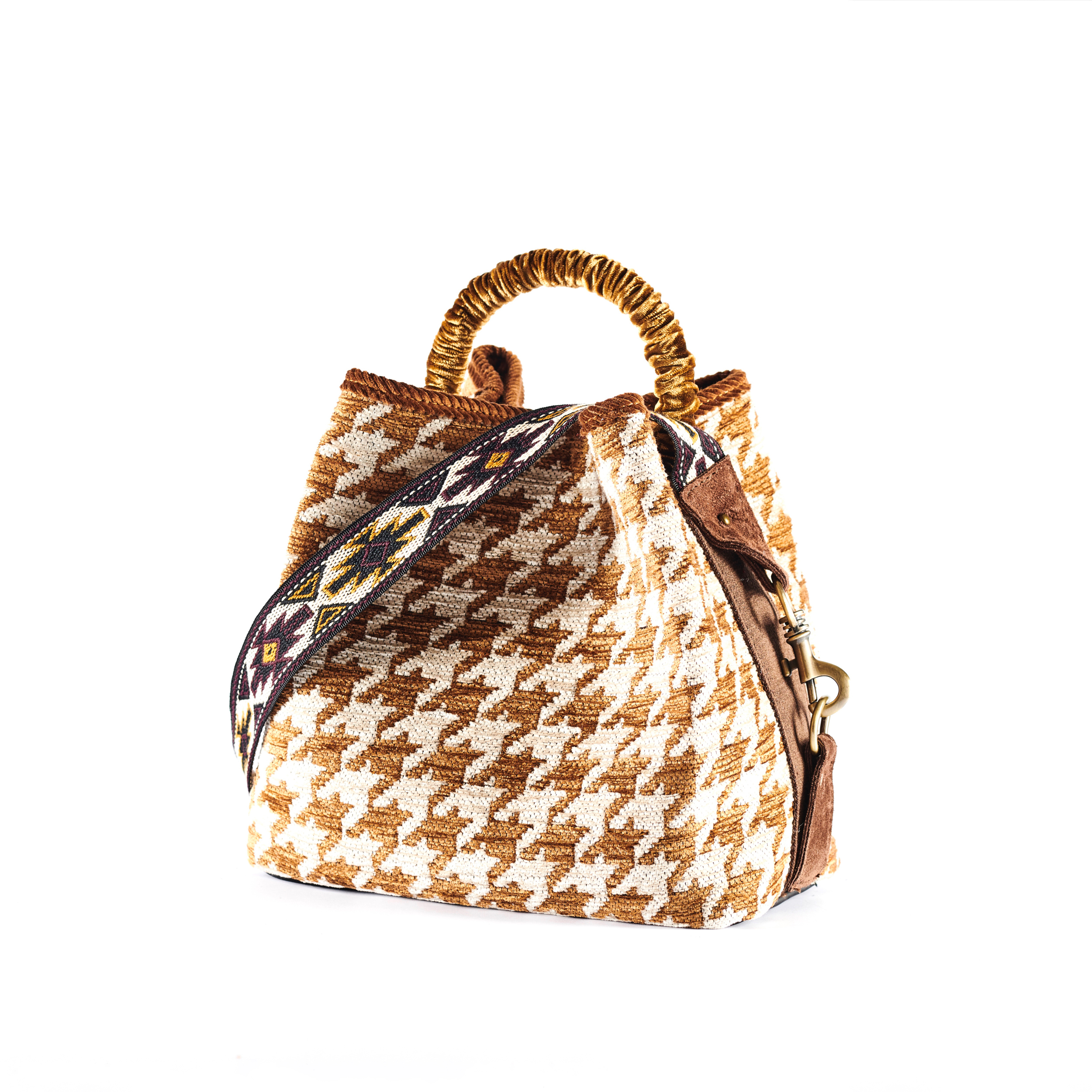 Secchiello in ciniglia jacquard con manico in velluto, tasca interna e tracolla fantasia etnica con dettagli in camoscio.